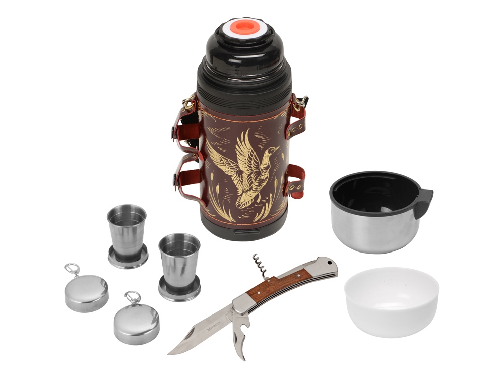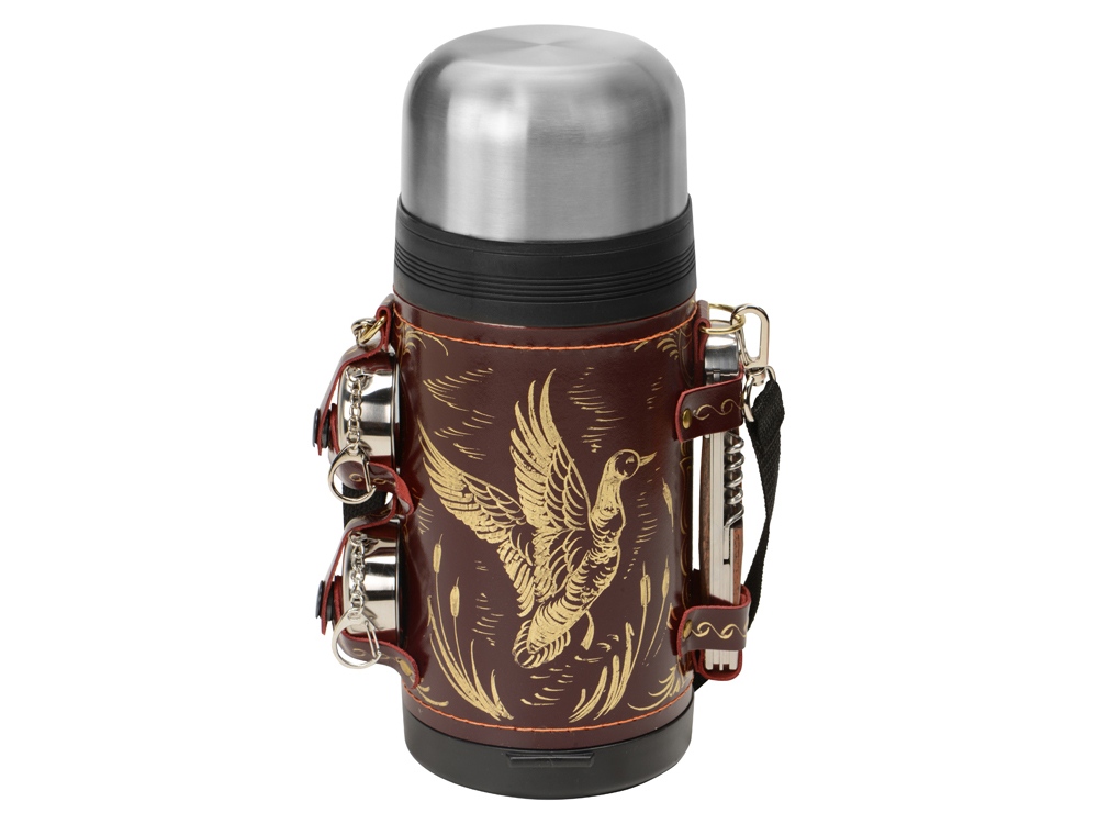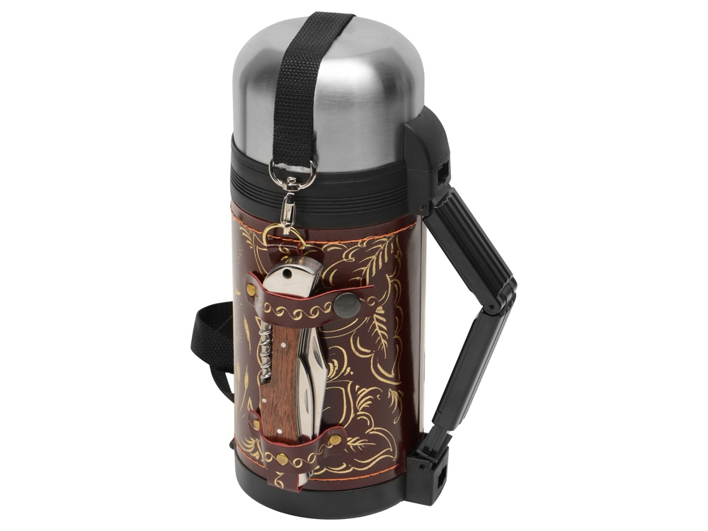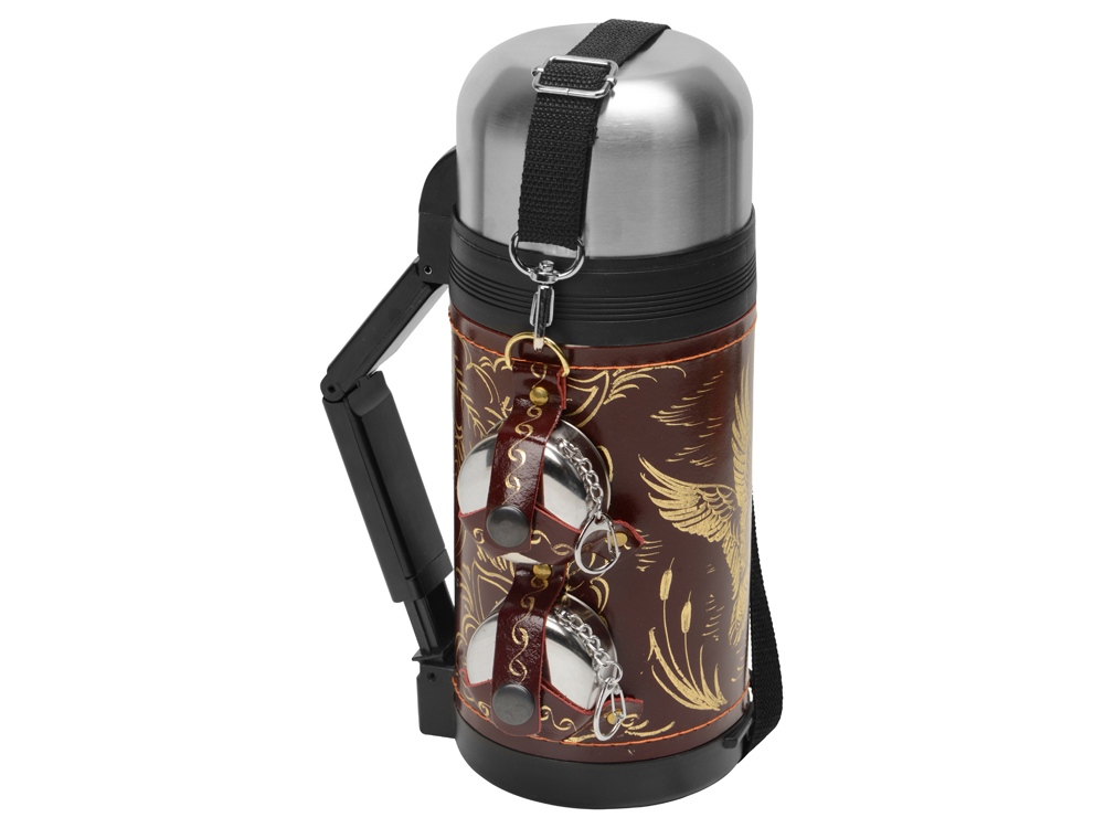 Описание: Отличный подарочный термос для дорогого вам человека! Включает в себя термос на 1,2 л в чехле из натуральной кожи с художественным выжиганием, 2 складных стакана и многофункциональный нож. Каждый предмет надёжно закреплён на своём месте кожаными ремешками. Невозможно что-то забыть - пустое место сразу бросится в глаза. В комплекте: - Термос 1,2л (нерж.сталь) с металлической колбой в чехле из натуральной кожи с художественным выжиганием - 1 шт. - Стакан складной 60 мл (нерж.сталь) - 2 шт. - Нож многофункциональный (нерж.сталь) - 1 шт.