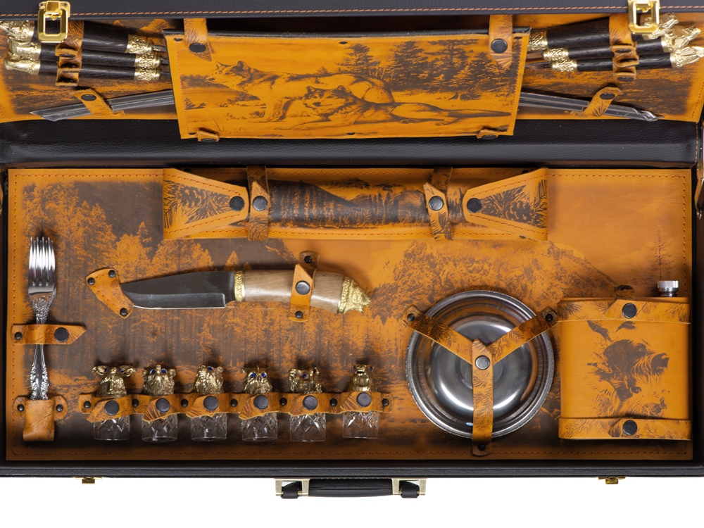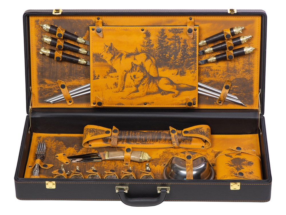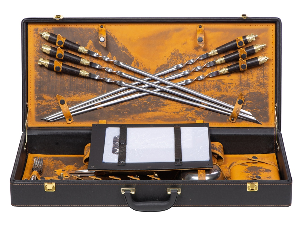 Описание: Кейс из сплит-кожи, с повышенной износостойкостью, внутренняя отделка натуральная кожа с художественным выжиганием. В комплект входит: - шампура большие d2,7 х 66 см - 6 шт - шампура мленькие 34,5 х 1 х 1,9 см- 6 шт - доска разделочная 29,5 х 20 см - вилка 19 х 2,5 х 1,8 см- 6 шт - нож 23 х 2,8 х 2,5 см - стопка 30 мл- 6 шт - тарелка d15 х 5 см- 6 шт - фляга 12,4 х 4 х 16 см - мангал 24,5 х 34,7 х 16,7 см