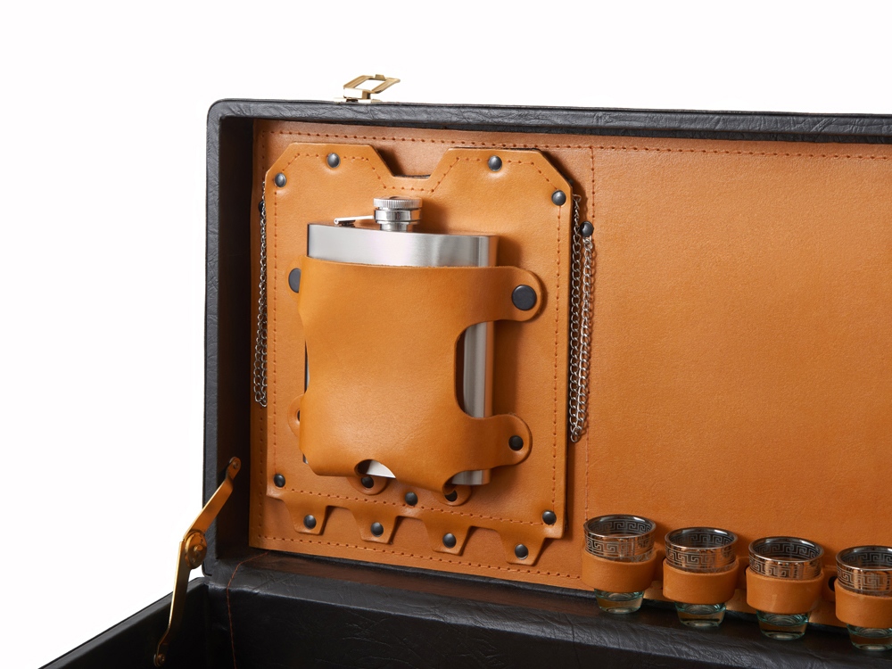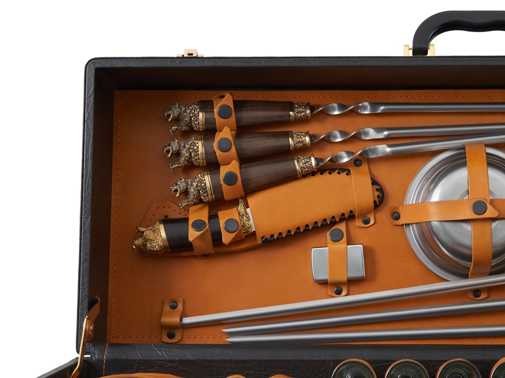 Описание: Кейс из сплит-кожи, с повышенной износостойкостью, внутренняя отделка натуральная кожа. Все аксессуары надежно крепятся к кейсу кожаными ремешками на кнопке, обеспечивая удобство транспортировки и сохранность содержимого. В комплект входит: - шампура большие- 6 шт - фляга 500 мл - фляга 250 мл - тарелка- 6 шт - вилка- 6 шт - ложка- 6 шт - стопка 25 мл- 6 шт - нож Тяпка - нож разделочный - зажигалка