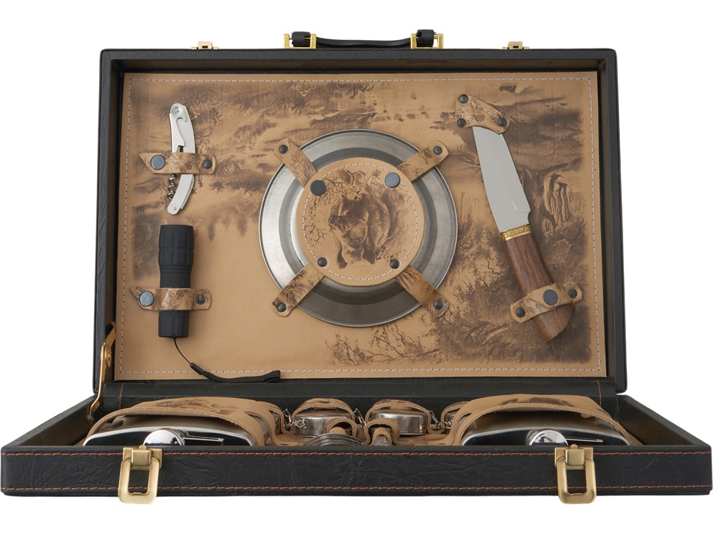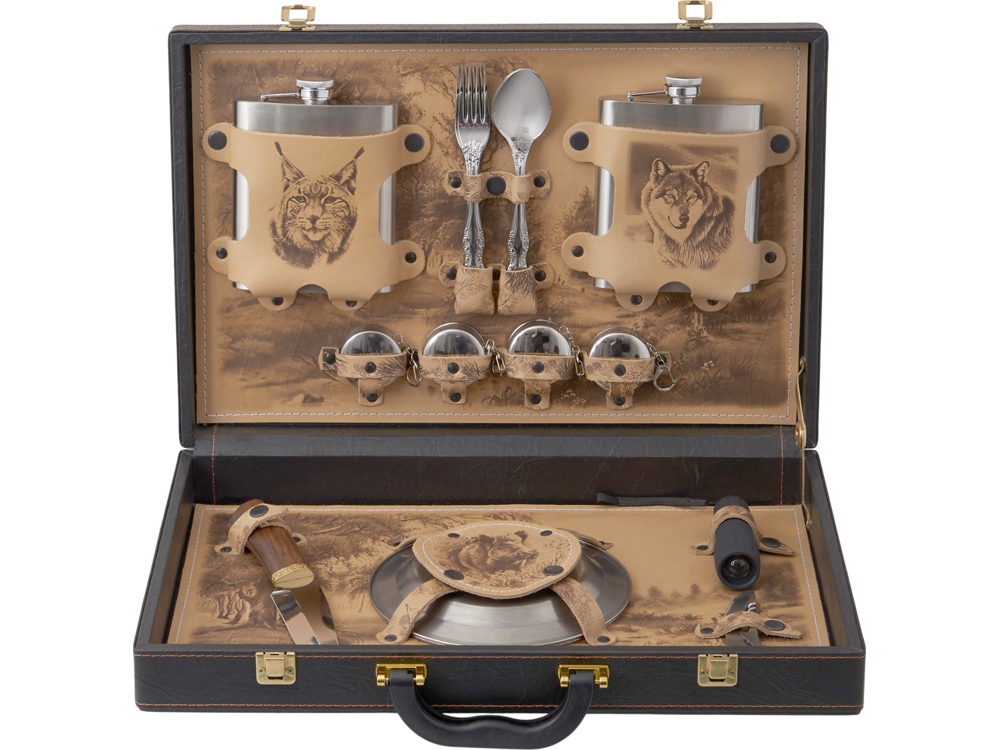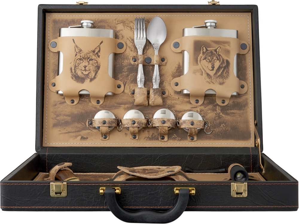 Описание: Погрузитесь в мир роскоши и комфорта с нашим эксклюзивным подарочным набором. Этот тщательно продуманный комплект идеально подходит для тех, кто ценит стиль и качество в каждом моменте отдыха на природе. Все комплектующие упакованы в кейс из сплит-кожи с внутренней отделкой из натуральной кожи, украшенной художественным выжиганием. Обратите внимание, что художественное выжигание может отличаться от представленного на фото, так как это ручная работа, что делает каждый экземпляр по-настоящему уникальным. В комплекте: - Фляжка 500 мл- 2 шт - Вилки (нерж. сталь)- 4 шт - Ложки (нерж. сталь)- 4 шт - Стопки складные (нерж. сталь)- 4 шт - Тарелки (нерж. сталь)- 4 шт - Штопор- 1 шт - Нож- 1шт - Фонарик- 1шт (батарейки AAA- 3 шт в комплекте)