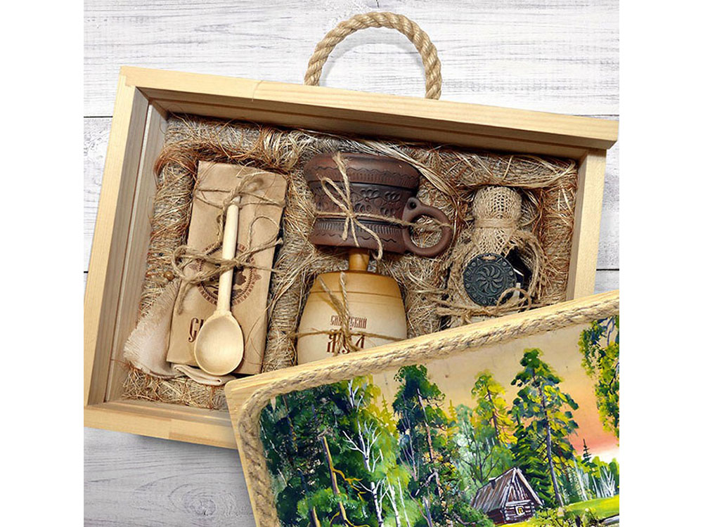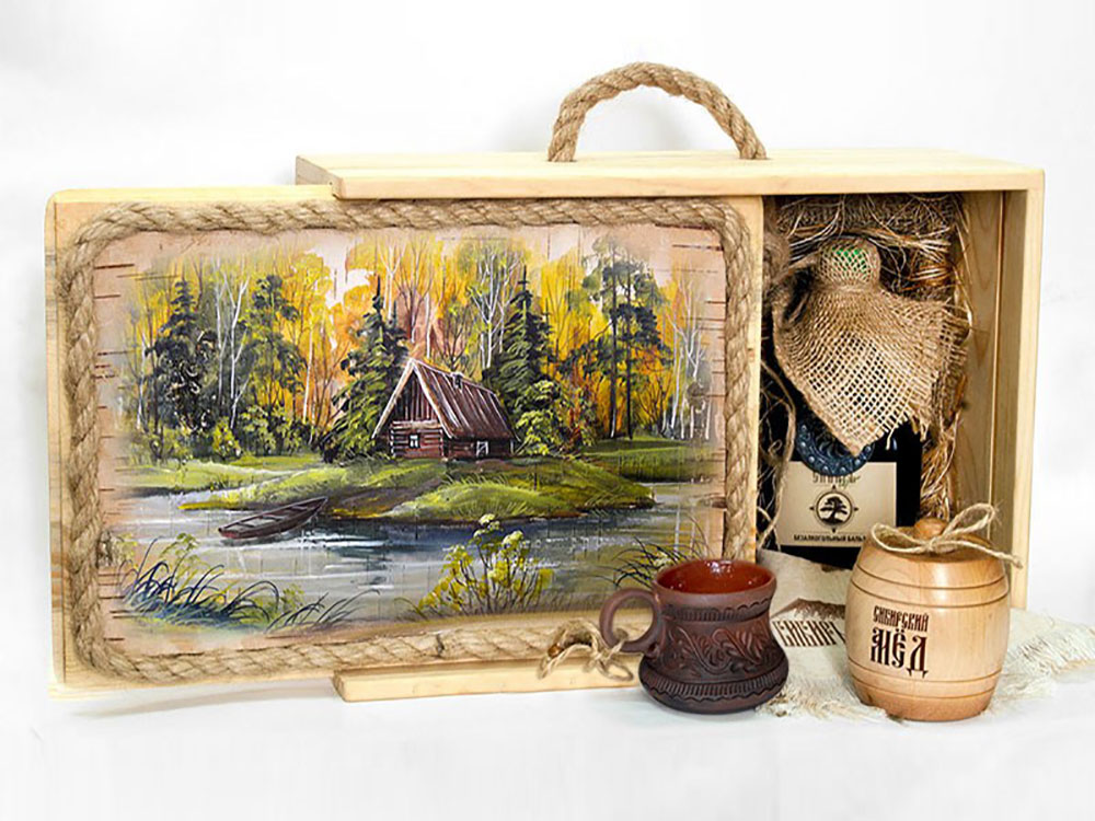 Подарочный набор в уникальном деревянном коробе ручной работы с рисунком на бересте: