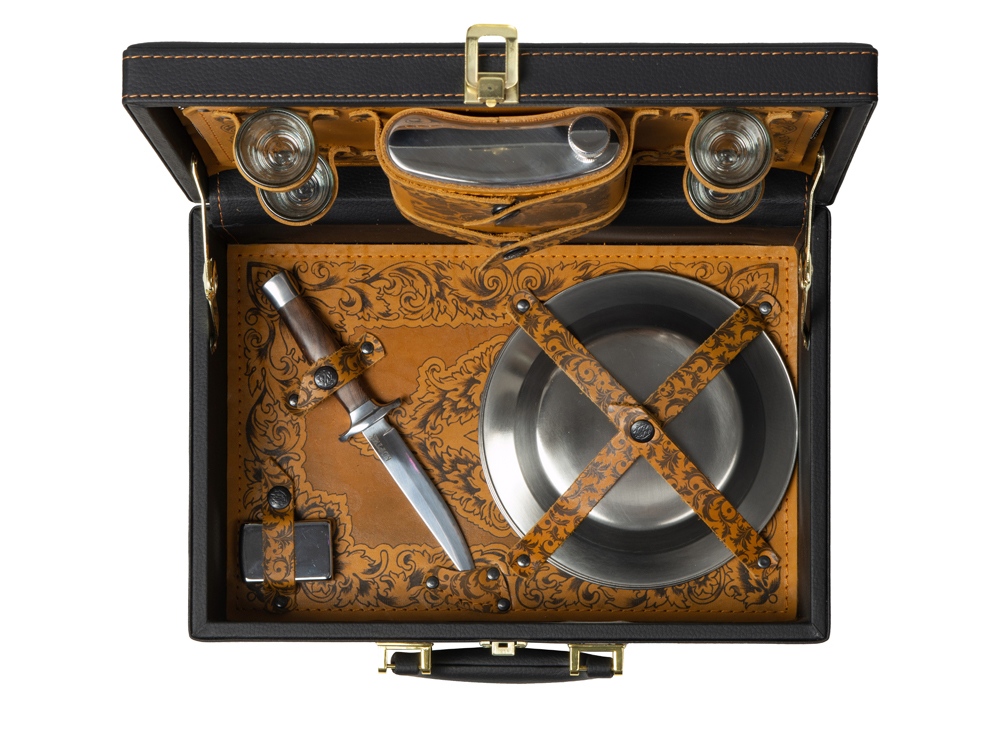 Описание: Кейс из сплит-кожи, с повышенной износостойкостью, внутренняя отделка натуральная кожа. В комплекте: Фляга 580 мл (нерж.сталь) – 1шт. Стопка 40 мл (стекло) – 4 шт. Зажигалка – 1 шт. Нож (нерж. сталь) – 1 шт. Тарелка – 4 шт.