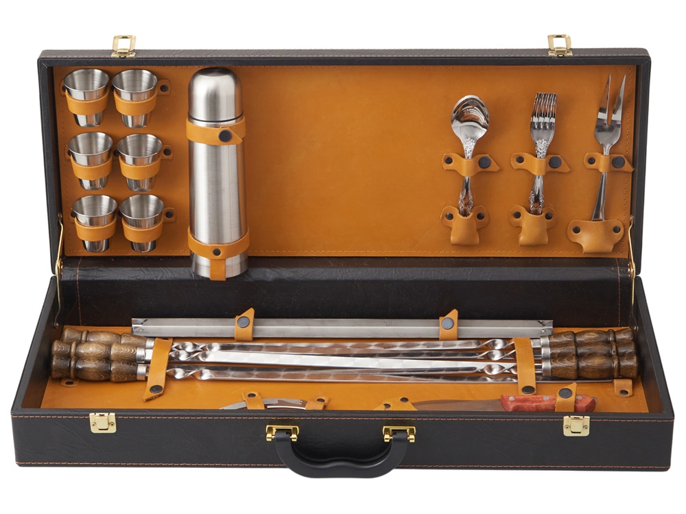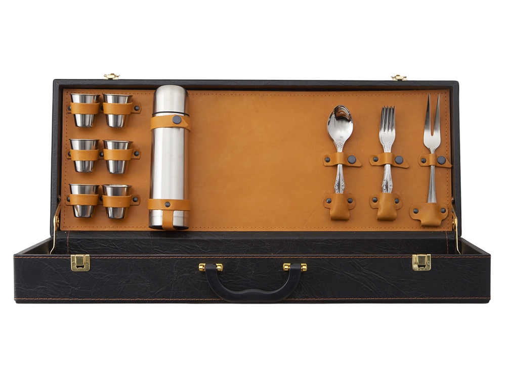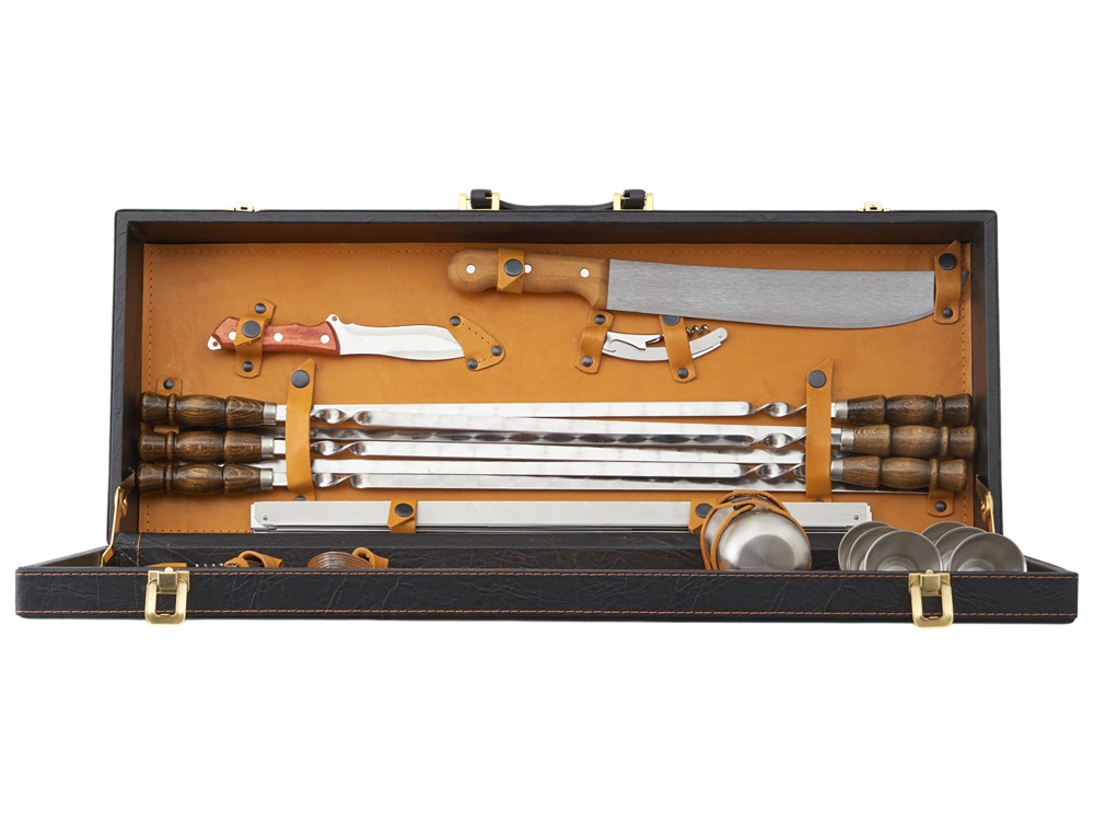 Все аксессуары надежно крепятся к кейсу кожаными ремешками на кнопке, обеспечивая удобство транспортировки и сохранность содержимого.