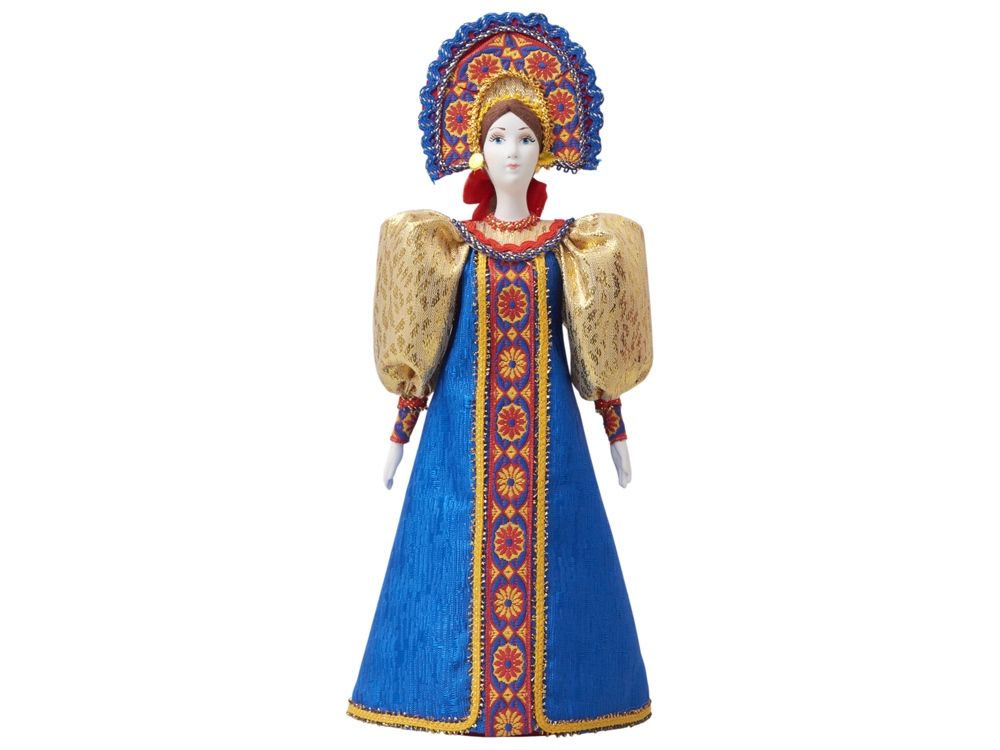 - Куклу ручной работы: сувенирная фарфоровая кукла в традиционном девичьем праздничном костюме. Яркий сарафан синего цвета, пышные рукава и кокошник с богатым декором отражают подлинный облик русского народного наряда.