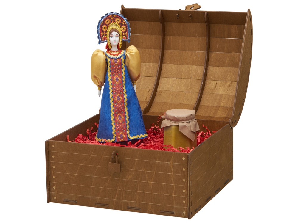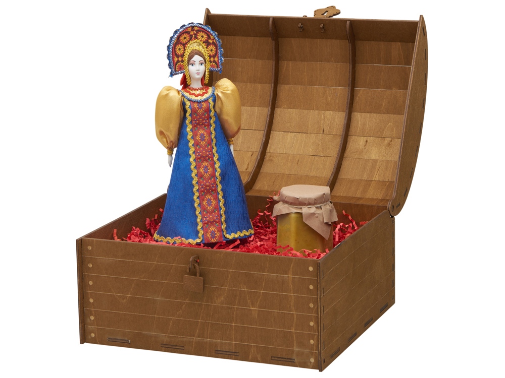 Описание: Очарование русских традиций, домашнего уюта и изысканных вкусов соединилось в этом уникальном подарке. Набор создан для тех, кто ценит подлинную красоту и желает подарить незабываемые эмоции. Что внутри: - Фарфоровая кукла в народном костюме ручной работы: расписной сарафан и кокошник с традиционной вышивкой воссоздают образ русской красавицы. - Крем-мёд с лаймом и имбирём (250 г): нежная текстура с яркой цитрусовой ноткой и тёплым имбирным оттенком. Изысканное лакомство для истинных гурманов. - Элегантное оформление: декоративная стружка придаёт композиции глубину и благородство, бережно сохраняя все элементы набора. Роскошная упаковка: деревянный сундук с изящным замочком превращает вручение подарка в особый ритуал. Дополнительное брендирование шильдом спектрум делает презент эксклюзивным и памятным. Идеальный выбор для тех, кто ищет не просто сувенир, а настоящее произведение искусства с русской душой.