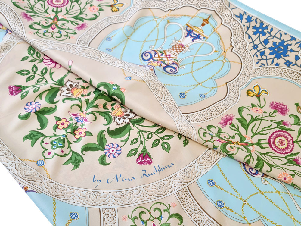 Платок Сады Востока от бренда Русские в моде” by Nina Ruchkina посвящен экзотической красоте, женской привлекательности и очарованию. В центре полотна расположились цветы дивного сада, олицетворяющие собой процветание, мир и земную любовь. Рядом изображены кувшины, наполненные росой молодости и секретами вечно цветущих восточных красавиц.