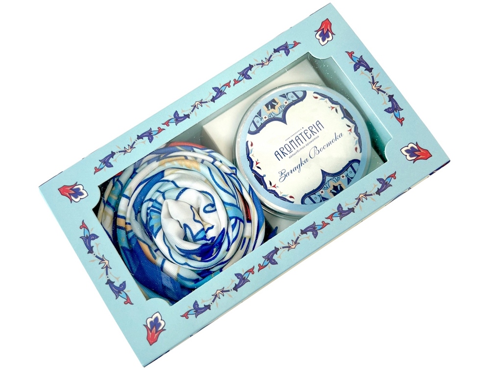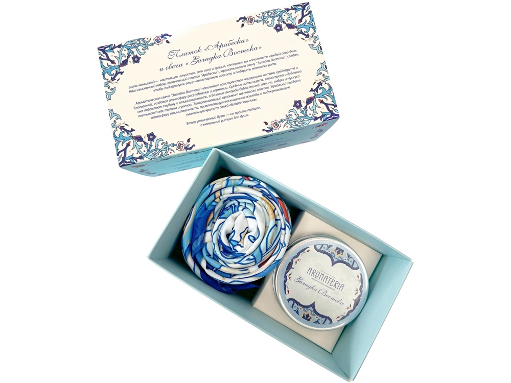платок- 70% искусственный шёлк, 30% вискоза, свеча- алюминий/натуральный соевый воск, парфюмерная композиция |