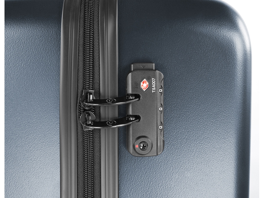 Внешняя организация: телескопическая ручка, кодовый замок TSA, 4 двойных колеса, боковая ручка, ручка на дне