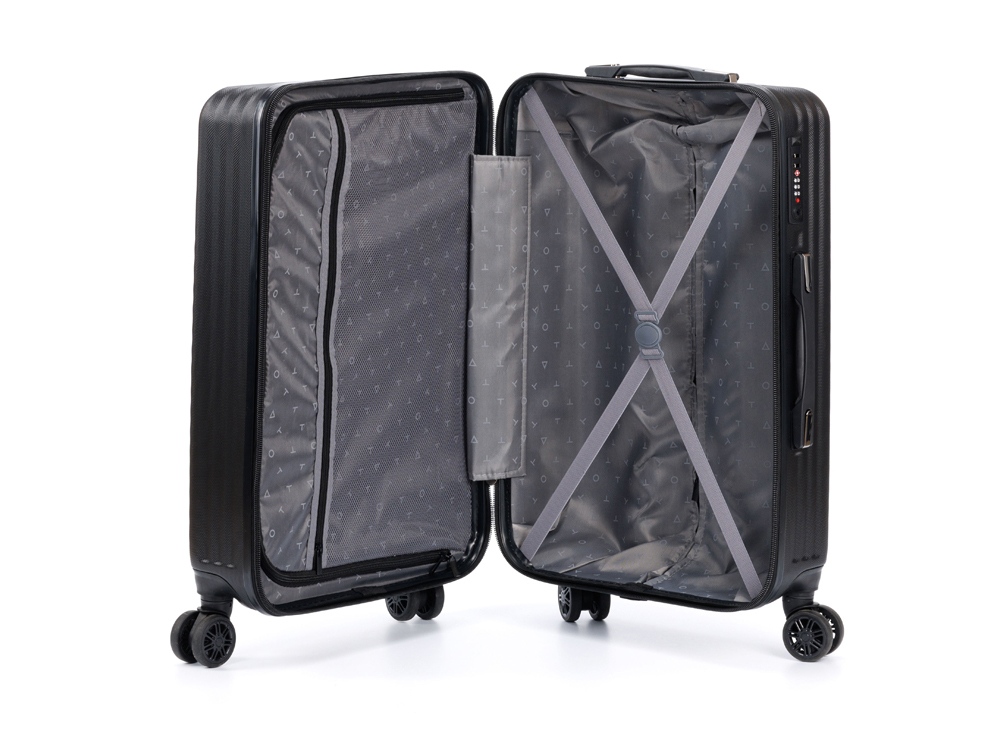 Чемодан полностью раскрывается на 2 вместительных отделения, с перегородкой на молнии и ремнями в форме X для надежной фиксации вещей на месте.