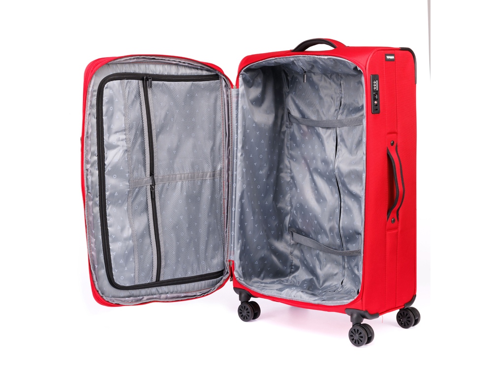 Чемодан полностью раскрывается на 2 отделения, с перегородкой на молнии и ремнями для надежной фиксации вещей на месте.