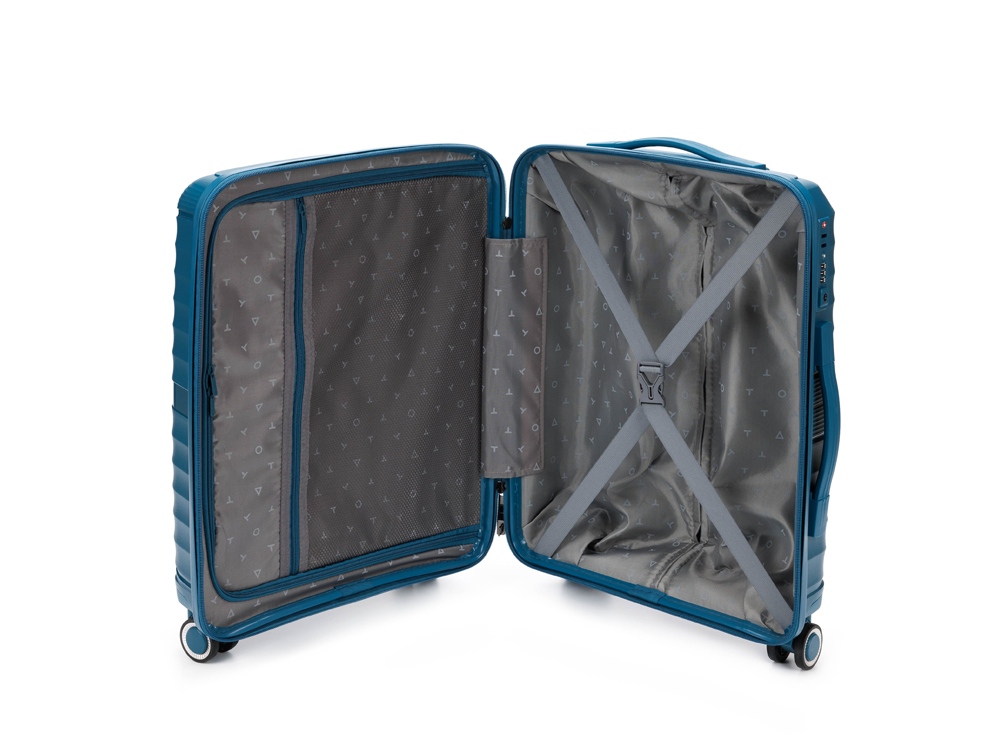 Чемодан полностью раскрывается на 2 вместительных отделения, с перегородкой на молнии и ремнями в форме Y для надежной фиксации вещей на месте.
