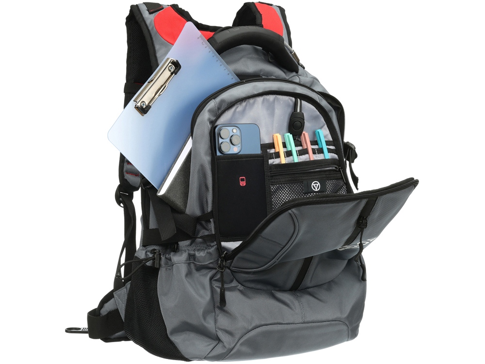 Благодаря боковым карманам, вы можете носить с собой бутылку с водой или зонт. Спинка и ремни оборудованы системой циркуляции воздуха. Карман-органайзер и кольцо для ключей позволят вам упорядоченно хранить большое количество мелких вещей. Усиленная эргономичная ручка с металлическим тросом позволяет носить рюкзак не только на спине, но и в руках, когда это необходимо. Поясной ремень для поддержания рюкзака сделает ношение рюкзака еще более удобным. Рюкзак выполнен в сером цвете с красной отделкой, что делает его универсальным и стильным. Объём 30 л позволяет вместить всё необходимое.
