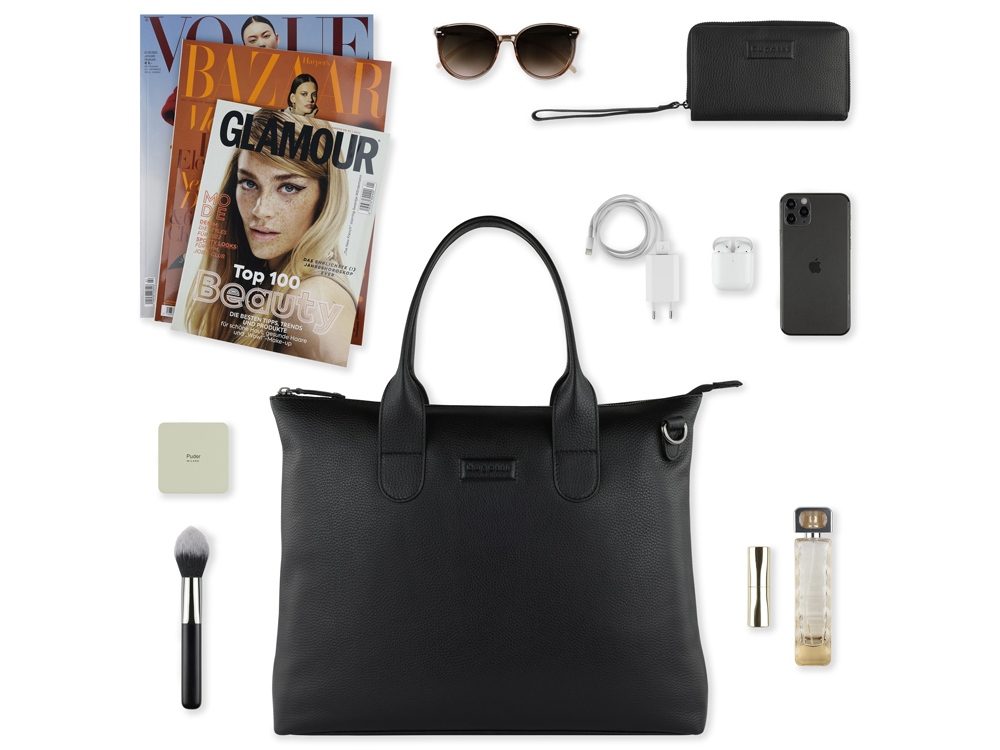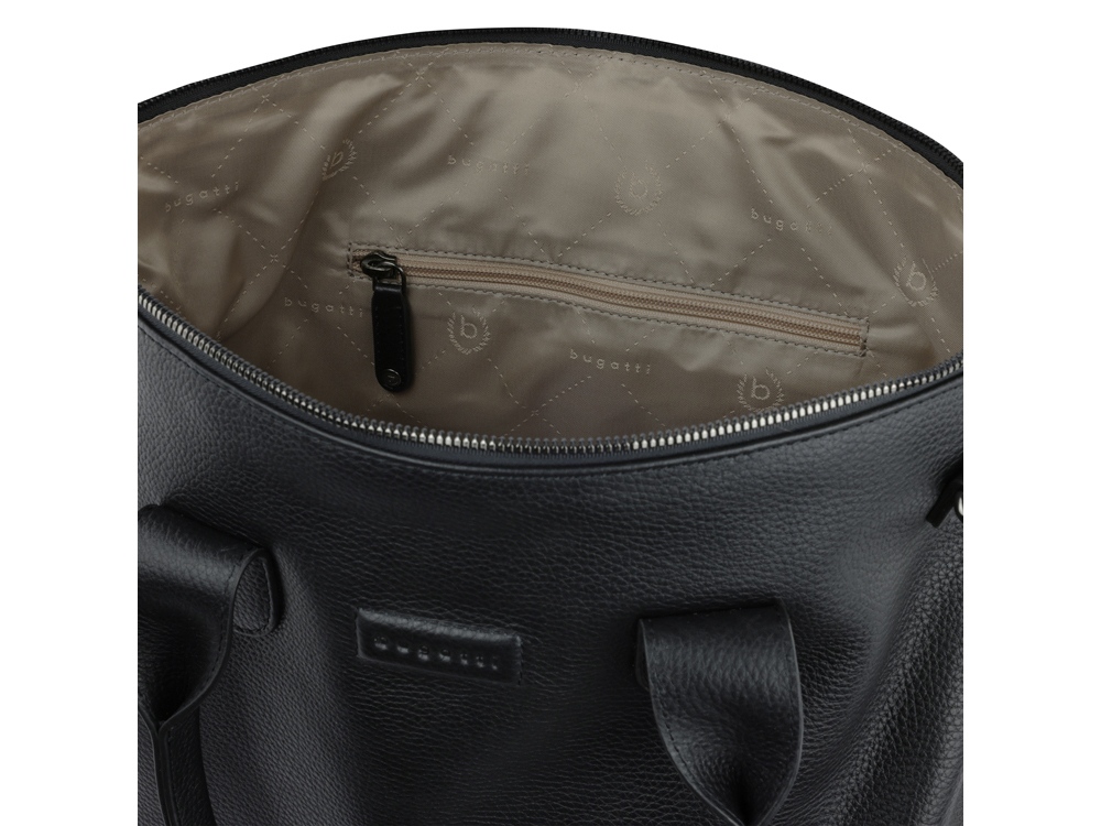 Функциональная организация: основное отделение на молнии с карманом на молнии, 2 открытых кармана, задний карман на молнии, 2 ручки, съемный регулируемый плечевой ремень (до 130 см).
