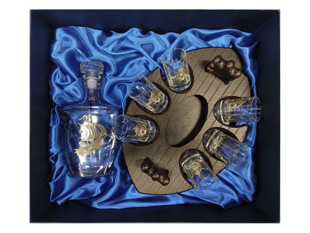 Описание: Набор для водки со штофом. В набор входит штоф 0.5 л с оловянным барельефом, шесть стопок 60 мл с оловянным барельефом и подставка мини-бар в форме корабля.